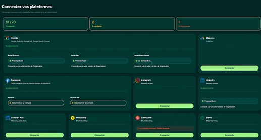 Analytics, SEO, Ads, GEO… Tous vos outils marketing sont regroupés dans un seul espace pour une lecture claire et cohérente de vos performances.